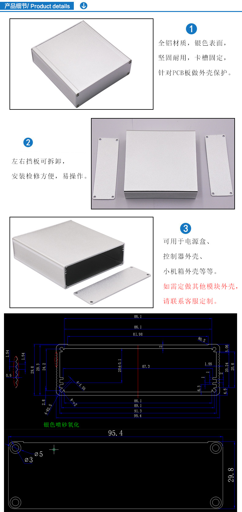 特點:1.全鋁材質,銀色表面,堅固耐用,卡槽固定,針對PCB板做外殼保護。