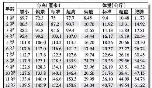0-12歲男孩身高、體重表